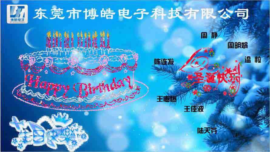 12月24日晚上八點,博皓硅膠按鍵廠舉行了年終員工生日會。12月份壽星一共有7位,來自不同的硅膠生產部門。本次活動為2016年博皓電子舉行的12期生日會活動畫上了圓滿的句號。