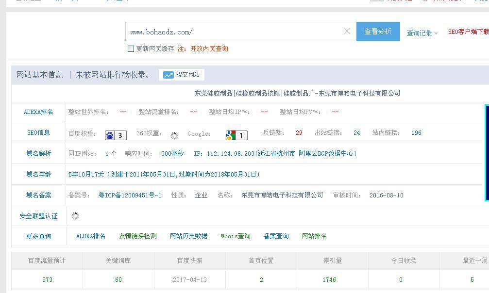 今天早上小編查詢博皓電子官網(wǎng)的站長的SEO數(shù)據(jù),發(fā)現(xiàn)一個(gè)不小的驚喜,那就是博皓電子(m.qitil.cn)官網(wǎng)百度權(quán)重到3了。之前小編一直在心中提問,硅膠制品行業(yè)的官網(wǎng)可以優(yōu)化到3不?當(dāng)時(shí)心中是認(rèn)為不太可能的,今天也終于實(shí)現(xiàn)了。