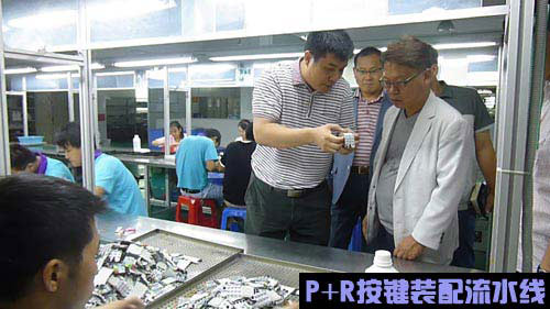 在生產(chǎn)現(xiàn)場,吳總為cisco領(lǐng)導(dǎo)講解P+R按鍵的裝配知識(shí)以及工藝生產(chǎn)難點(diǎn)。