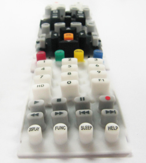 - 產品簡介:此款產品是采用多種硅膠顏色混合模壓成型,是一款智能電視機的遙控器按鍵。主要的難點就在幾種顏色位置的控制及成型串色的不良率控制。,也可根據客戶需求來定制彩色硅膠遙控器按鍵,客戶只需提供圖檔或實物,博皓電子即可開模定制。