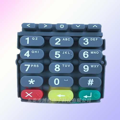 - 本款POS機按鍵是IC卡POS機上的硅膠按鍵,采用二次成型,表面絲印+噴涂+滴膠的工藝。博皓電子為您提供省心定制服務!